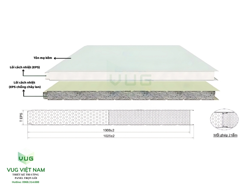 Panel EPS được sản xuất với lõi xốp Expand Polystyrene (EPS) có khả năng cách âm và cách nhiệt vượt trội. Bên ngoài là hai lớp tôn mạ kẽm phủ sơn tĩnh điện, giúp tăng tính thẩm mỹ, chống ăn mòn và đảm bảo độ bền lâu dài cho công trình.